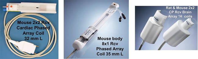 Transceiver (i.e., transmit & receive) radiofrequency (RF) coils include a rat body circularly polarized (CP) volume coil (86 mm inner diameter, ID), a rat brain/mouse body CP volume coil (40 mm ID), and a linear dual-tuned rat body 19F/1H volume coil (72 mm ID). Receive-only RF coils include rat and mouse brain CP surface coils, an animal cradle with mouse body 8x1 phased array coil (35 mm long), and an animal cradle with a 2x2 cardiac phased array (32 mm long). The system is capable of supporting multi-nuclear spectroscopy and imaging (see gyromagnetic ratios (PDF)).